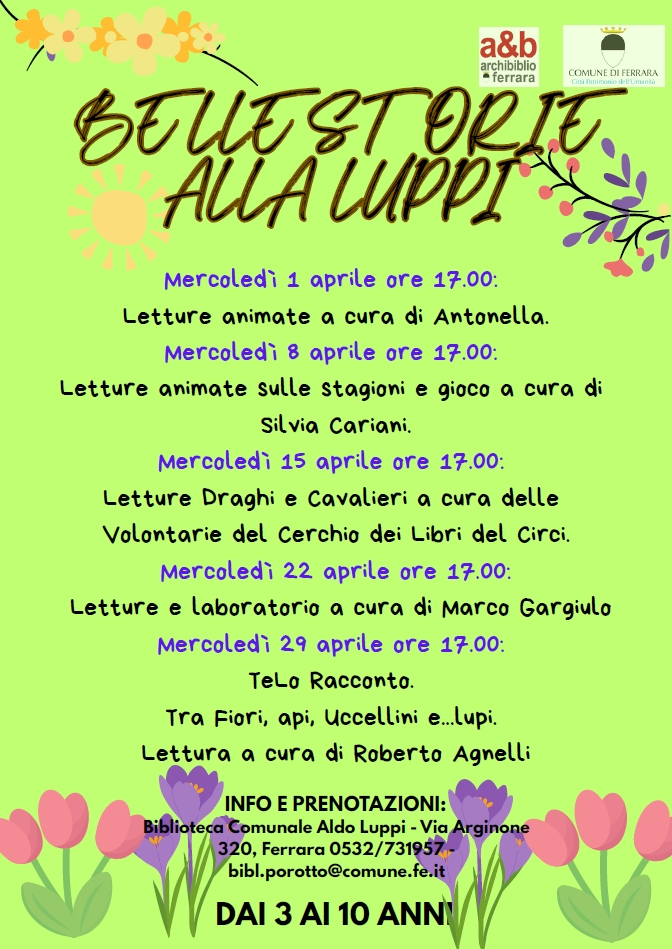 Le 'Belle Storie' per i più piccoli alla biblioteca Luppi tornano ad aprile, con un calendario di letture dedicate ai colori della primavera, ogni mercoledi pomeriggio. Il primo appuntamento sarà mercoledì 1 aprile 2026 alle 17:30 negli spazi della biblioteca comunale (in via Arginone 320) a Porotto, con le storie animate a cura della lettrice volontaria Antonella.