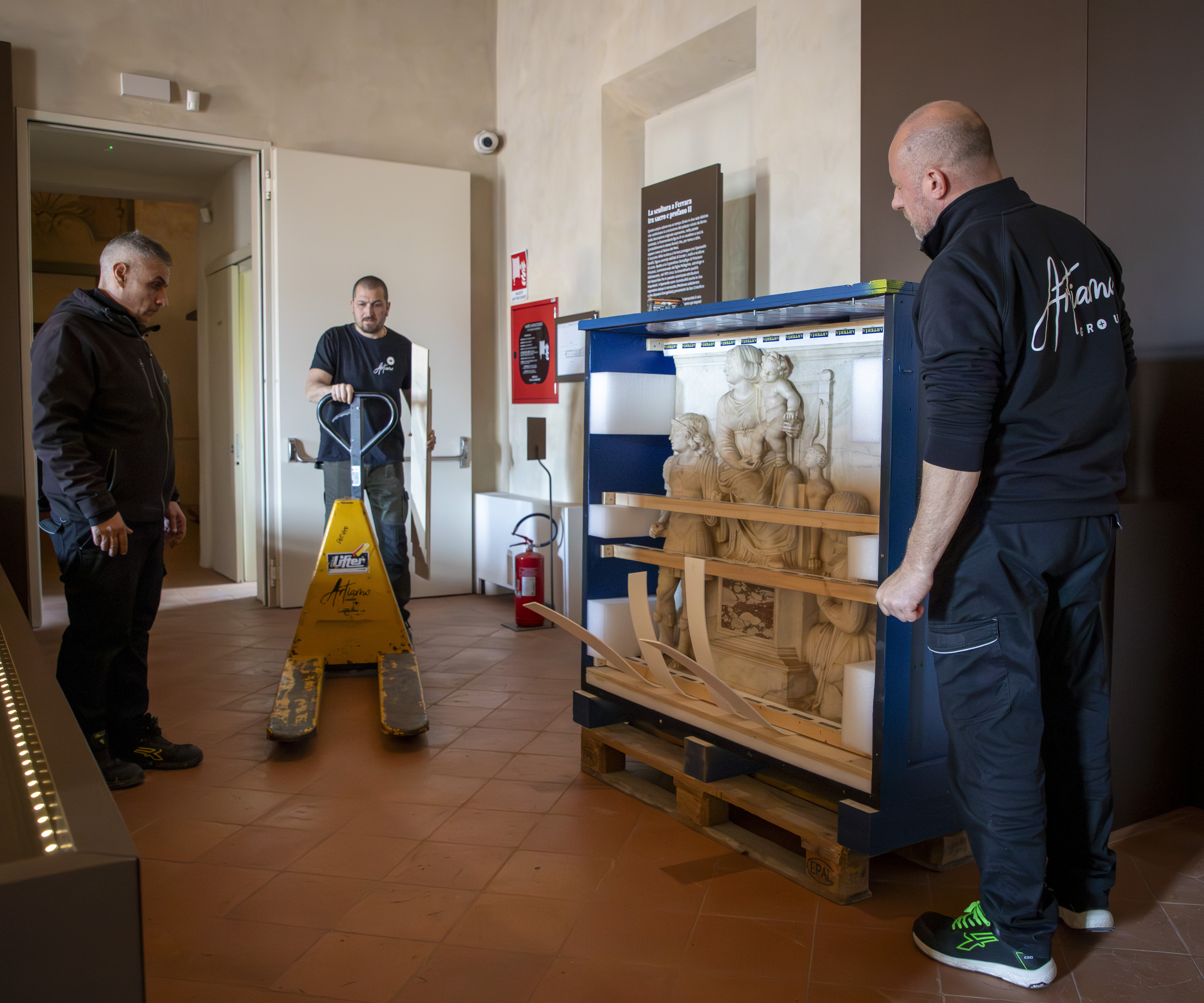 L'installazione delle due opere ha richiesto, nella giornata di lunedì 30 marzo, un intervento di movimentazione a museo chiuso. Se per il Busto di Ercole I d'Este le operazioni si sono svolte in modo ordinario, la Madonna in trono ha riservato uno spettacolo inatteso: il suo peso considerevole ha reso necessaria una movimentazione aerea, con l'utilizzo di una gru, che ha sollevato il gruppo marmoreo portandolo fino al primo piano, dove è ora stabilmente collocato. Un momento suggestivo, in cui una delle opere più raffinate del Rinascimento ferrarese ha attraversato il cielo sopra il Museo Schifanoia.