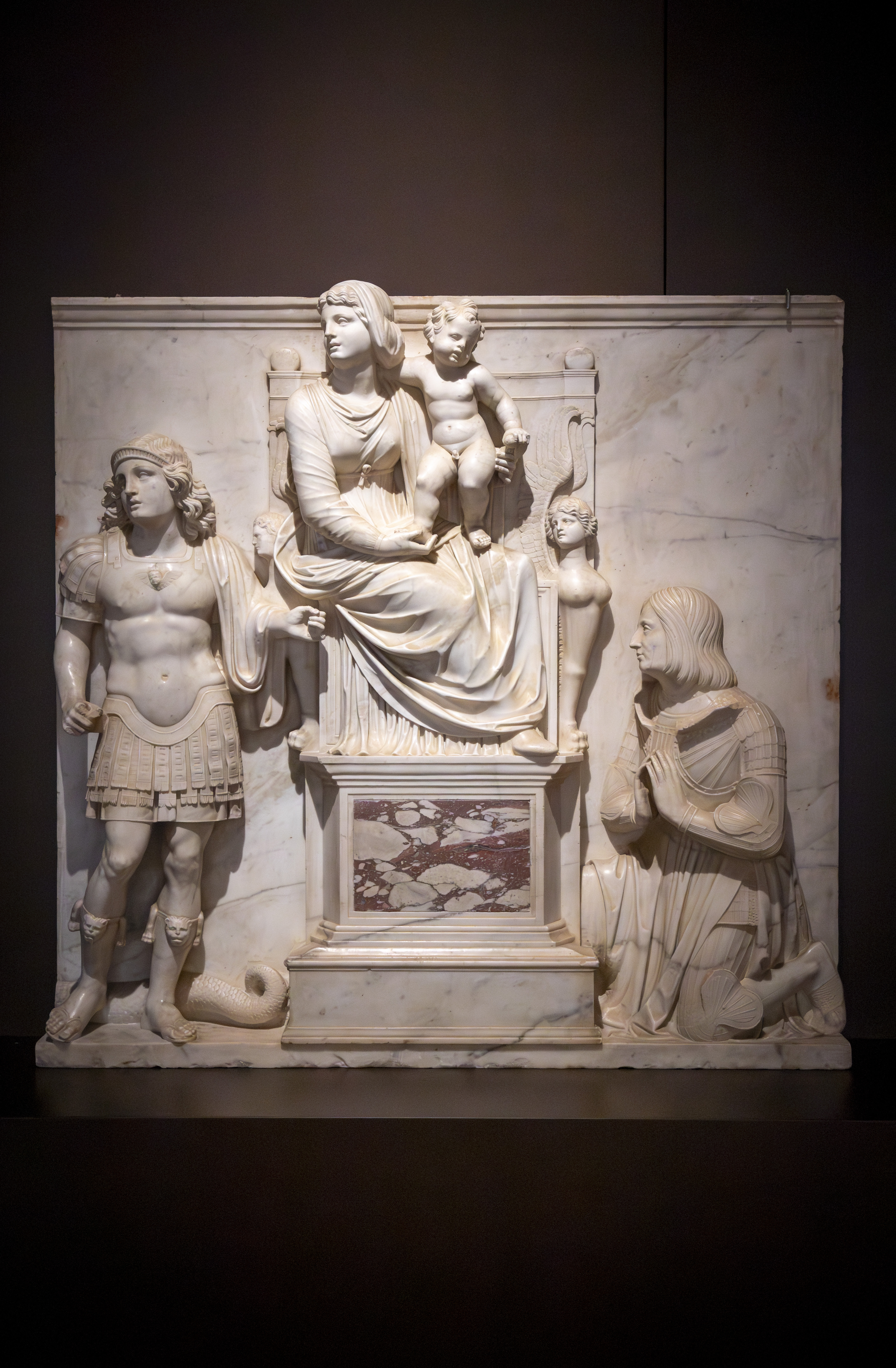 La Madonna in trono con il Figlio tra San Giorgio e guerriero orante (marmo bianco e pavonazzetto rosso, inv. OA1748; provenienza: Ferrara, Chiesa di San Domenico) si trova in sala 16, dedicata alla scultura del Cinquecento. Opera di Antonio Lombardo e bottega, testimonia con straordinaria chiarezza il rinnovamento portato a Ferrara da un artista formatosi a Venezia e nutrito dallo studio dell'antico: un linguaggio che si afferma rapidamente in città come punto di riferimento per la produzione locale.