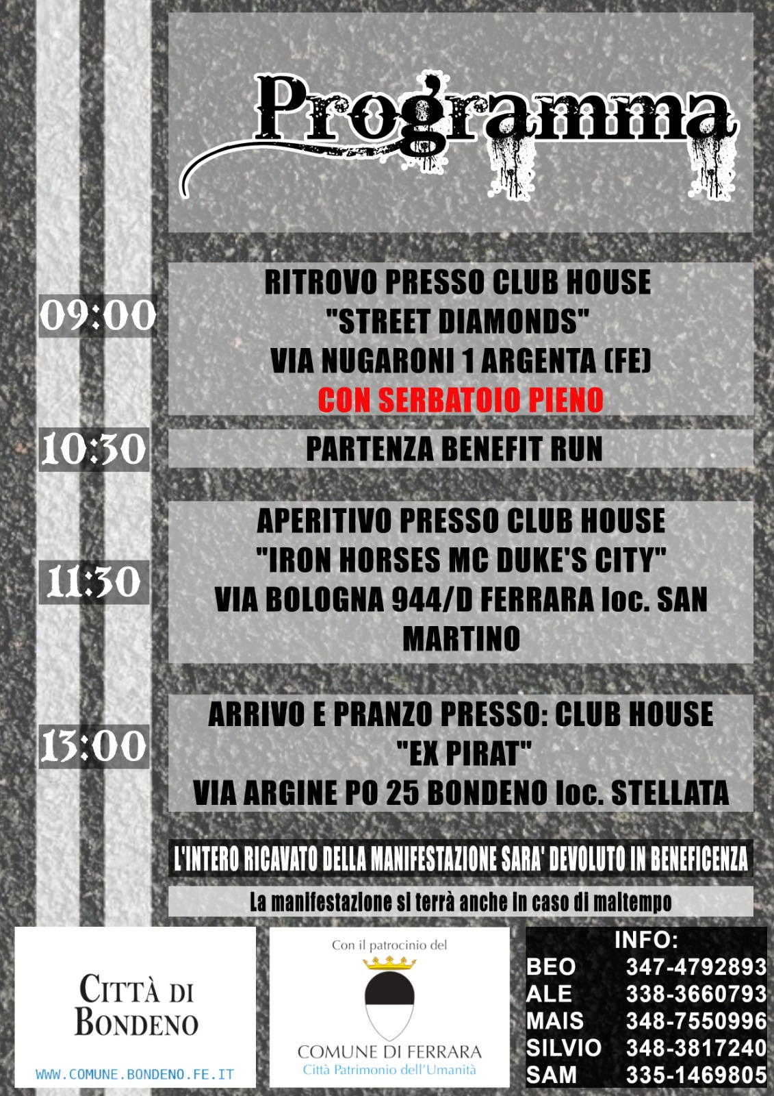 ll ritrovo dei motociclisti è fissato alle ore 9 presso la Club house Street Diamonds in via Nugaroni 1 ad Argenta, a serbatoi pieni. Il corteo partirà alle ore 10.30 e un'ora dopo, circa, è prevista una tappa aperitivo presso la sede di Iron Horses a San Martino (via Bologna, 944). L'arrivo, con pranzo, sarà a Stellata di Bondeno in via Argine Po, presso la sede degli Ex Pirat.