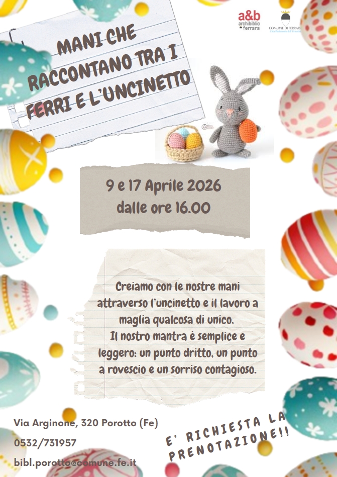 Ritornano anche ad aprile, con due nuove date, giovedì 9 e venerdì 17 alle 16:00, alla biblioteca comunale Aldo Luppi (via Arginone 320, Porotto), gli appuntamenti con la creatività dedicati all'arte dell'uncinetto e al lavoro a maglia.