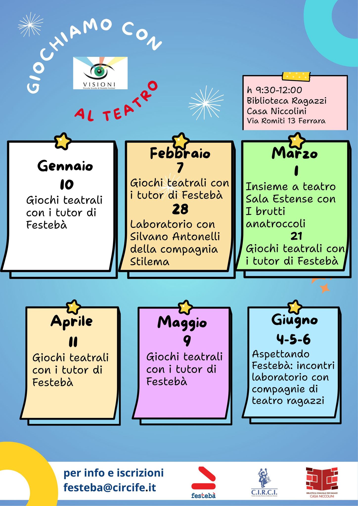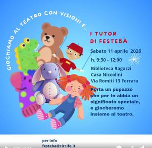 E' in programma per sabato 11 aprile 2026 alle 9:30 il nuovo appuntamento con 'Visioni. Piccola scuola di Festebà Festival' alla biblioteca comunale di Casa Niccolini (via Romiti 13, Ferrara). Bambini e ragazzi potranno partecipare al laboratorio "Giochiamo al teatro" a cura dei tutor del Gruppo di lavoro di Festebà.