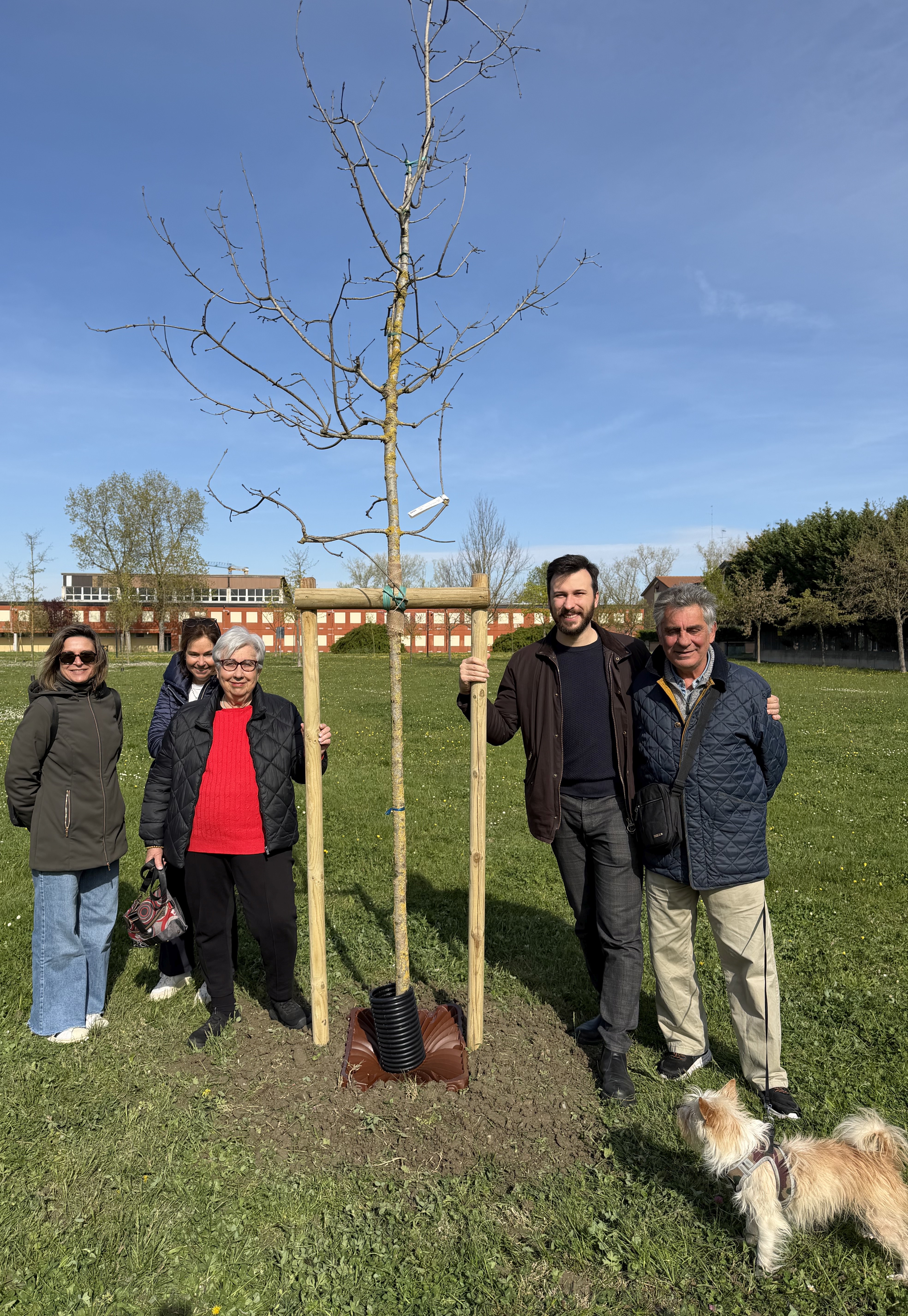 In foto il vicesindaco Balboni e Davide Casanova, presidente di Progea APS, insieme ad altri membri della stessa associazione ambientalista di volontariato che sarà coinvolta per l'annaffiatura durante la stagione estiva di alcuni degli alberi appena messi a dimora.