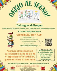 Appuntamento giovedì 23 aprile 2026 alle 17:00 alla biblioteca comunale Casa Niccolini (via Romiti 13, Ferrara), per bambini e ragazzi dai 3 ai 12 anni, con "Okkio al segno", laboratorio di disegno e frottage con i 'segni d’artista' di Alessandro Sanna. L'iniziativa è organizzata in occasione della festa del Patrono di Ferrara e della Giornata mondiale del Libro e del diritto d'autore, ed è a cura di Wally Panizzolo, bibliotecaria di Casa Niccolini.