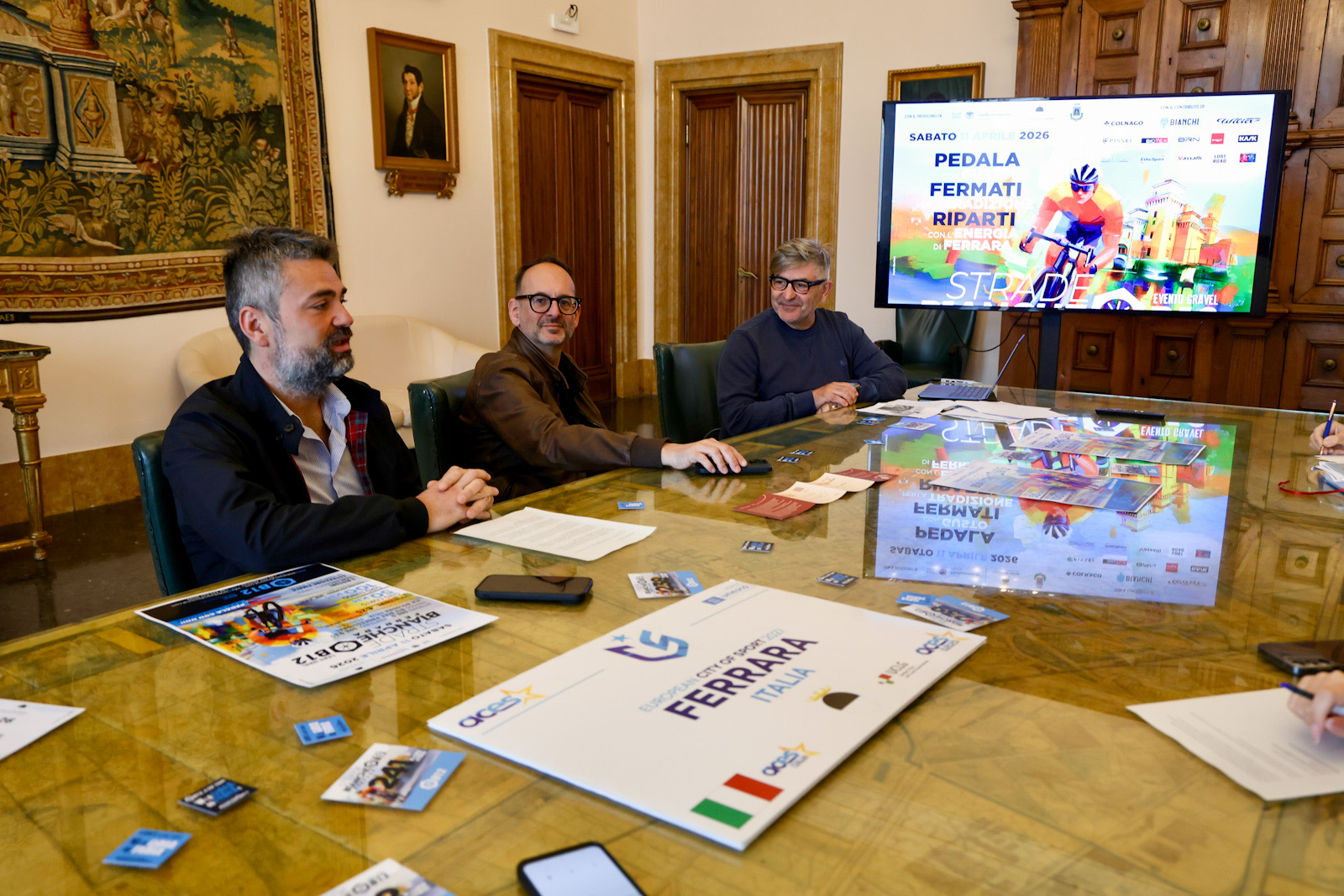 All'incontro con i giornalisti sono intervenuti l'assessore comunale allo Sport Francesco Carità, il direttore Confcommercio ASCOM Ferrara Davide Urban, l'organizzatore dell'evento per B12 Bike Professional Luca Agosti, la referente comunicazione dell'evento Vanna Bonazza.