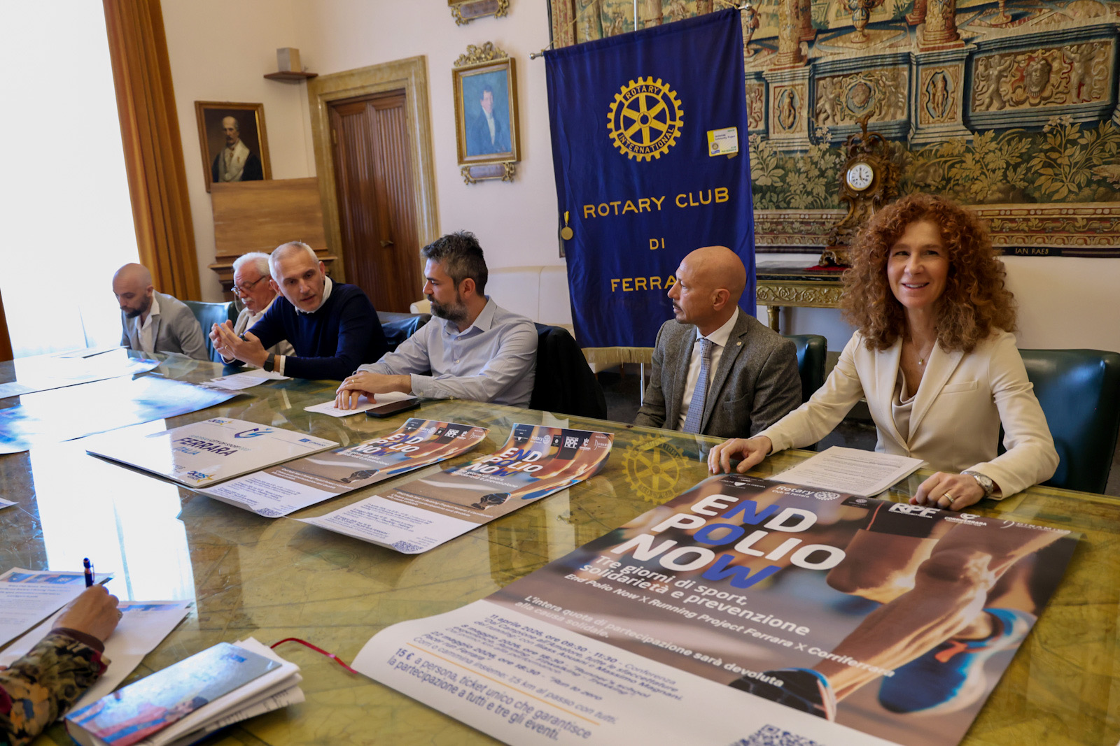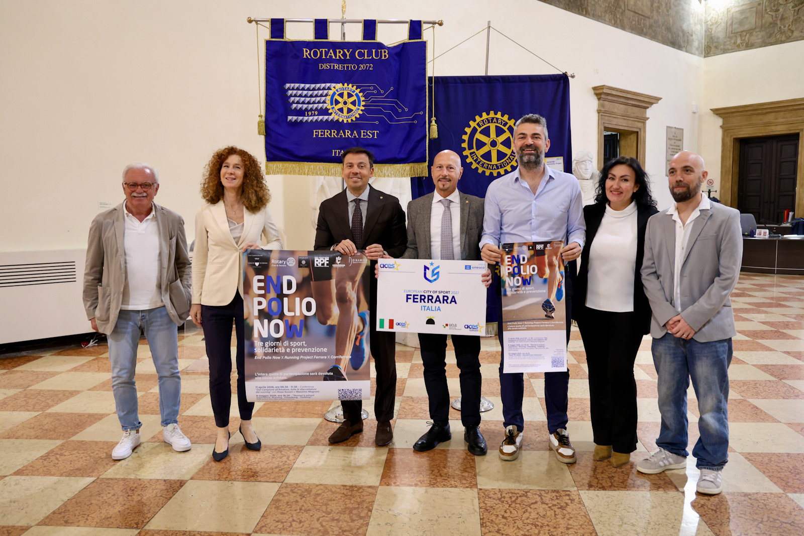 "End Polio Now - Running Project Ferrara 2026" è la manifestazione che comprende tre eventi (l'11 aprile, 8 maggio e 22 giugno 2026) dedicati al mondo della corsa, per unire sport, solidarietà e prevenzione. L'iniziativa è stata presentata giovedì 9 aprile 2026 nella sala degli Arazzi della residenza municipale di Ferrara.