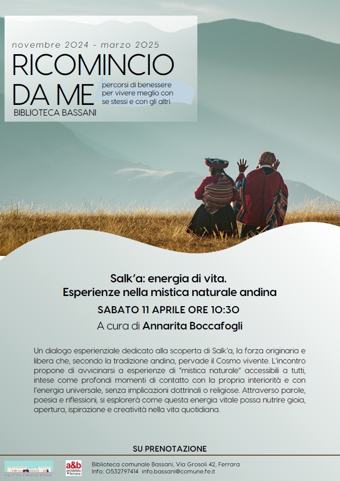 Un dialogo esperienziale dedicato alla scoperta di Salk’a, la forza originaria e libera che, secondo la tradizione andina, pervade il Cosmo vivente. A proporlo è il nuovo incontro del ciclo "Ricomincio da me" a cura di Annarita Boccafogli, in programma sabato 11 aprile 2026 alle 10:30 alla biblioteca comunale Bassani (via Grosoli 42, Barco, Ferrara)