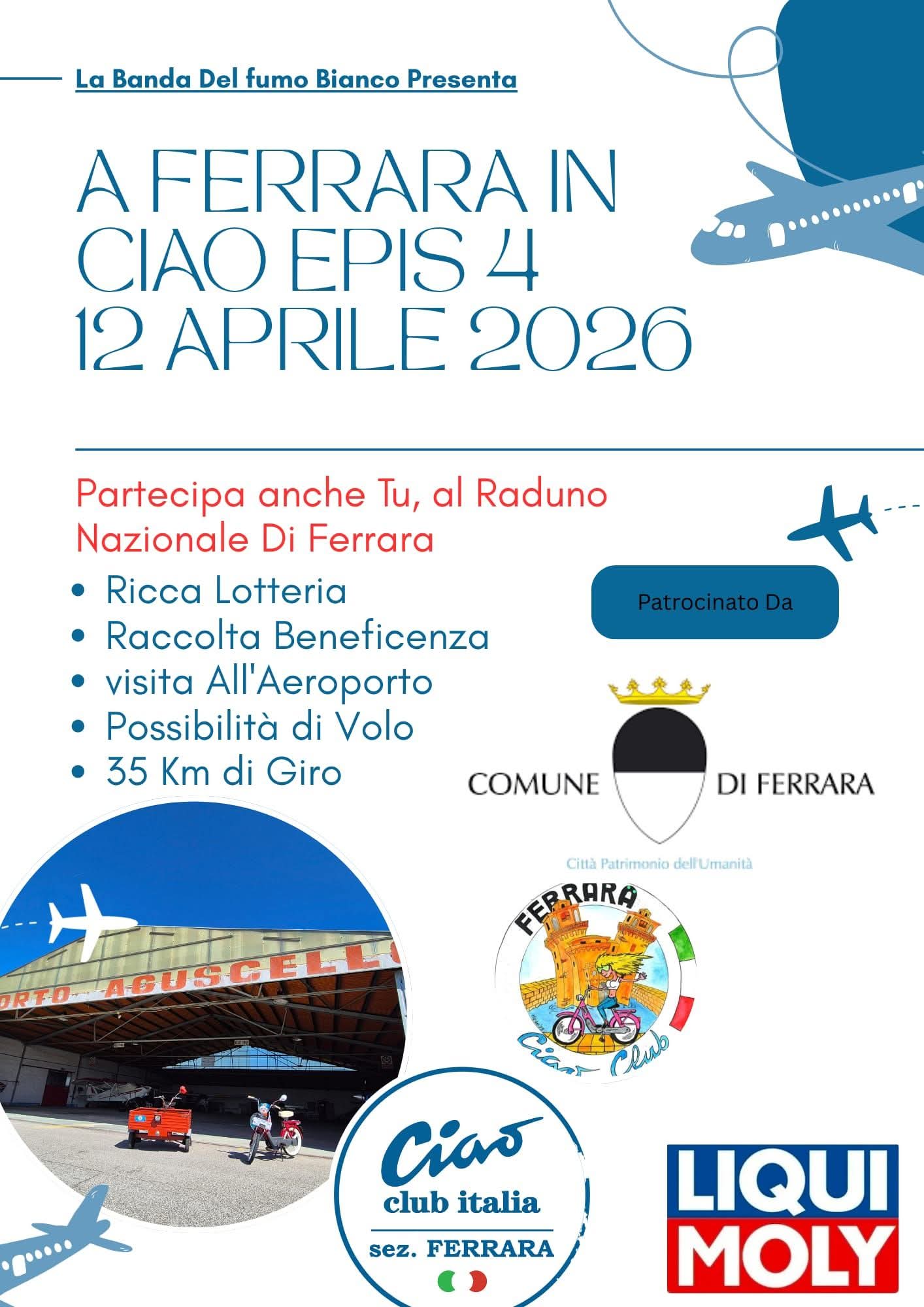 Sono previsti arrivi da Roma, Udine e Lecco. Tutti in Ciao. Tutti con la volontà di rendersi protagonisti di un gesto di generosità. La città è pronta ad accogliere il quarto raduno nazionale di "A Ferrara in Ciao", la manifestazione con finalità sociali promossa da "La Banda del Fumo Bianco" e patrocinata dall'Assessorato alle Politiche Sociosanitarie del Comune di Ferrara. L'iniziativa, in programma nella mattinata di domenica 12 aprile 2026, animerà le vie cittadine coinvolgendo partecipanti e curiosi in una giornata all'insegna dell'aggregazione e dell'impegno sociale.