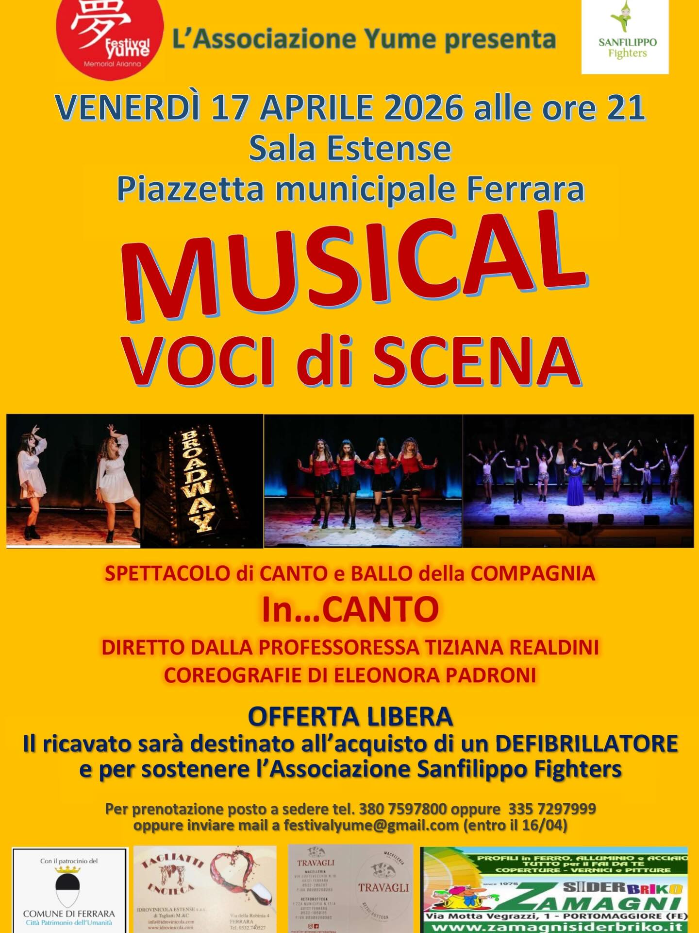 "Voci di scena" è il musical con finalità benefiche promosso dall'associazione Yume che andrà in scen con una trentina di brani interpretati da cantanti, ballerine e ballerini della compagnia In... Canto venerdì 17 aprile 2026 alla Sala Estense (piazza Municipio 14, Ferrara).