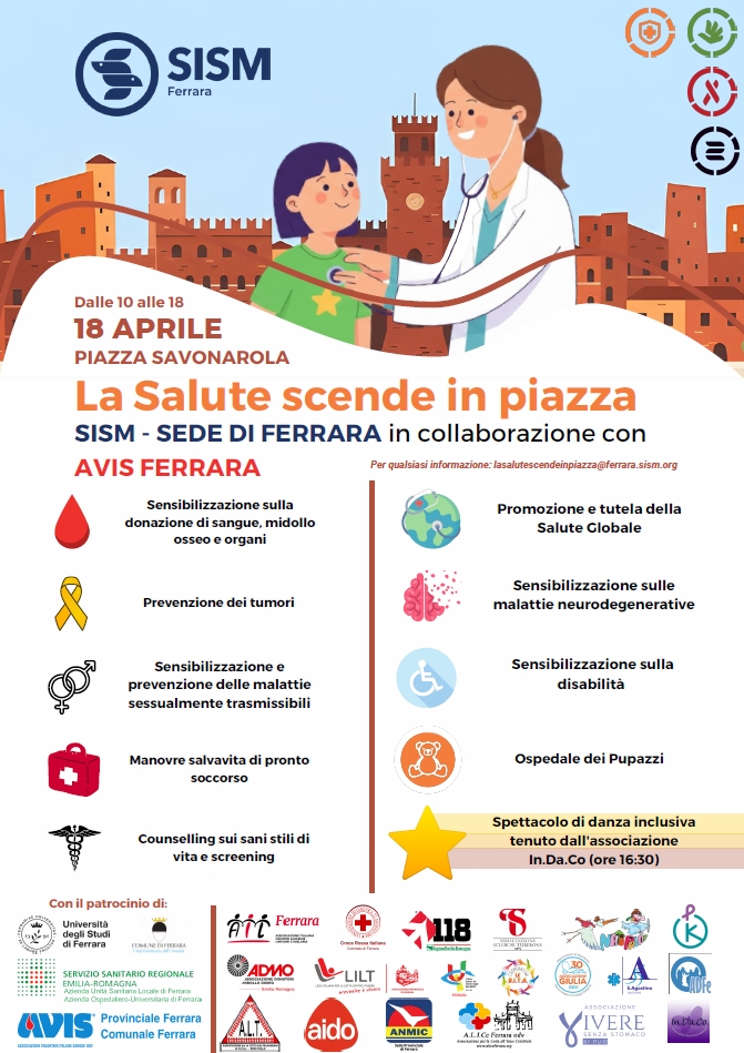 Il cuore di Ferrara trasformato in un grande spazio dedicato al benessere, alla prevenzione e alla partecipazione attiva. Sabato 18 aprile 2026 dalle 10:00 alle 18:00, piazza Savonarola accoglierà una nuova edizione de 'La Salute Scende in Piazza', la manifestazione dedicata all'ambito sociosanitario promossa dal Segretariato Italiano Studenti in Medicina (Sism) in sinergia con le Avis Provinciale e Comunale, e il patrocinio dell'Assessorato alle Politiche Sociosanitarie del Comune di Ferrara e delle Aziende Sanitarie Ferraresi. Sono 20 le associazioni aderenti, che saranno in piazza per promuovere un'iniziativa che porta la promozione della salute nel centro cittadino. Nei gazebo allestiti dalle associazioni verranno proposte attività gratuite per ogni età, ma anche divulgati materiali informativi per favorire consapevolezza nei cittadini.