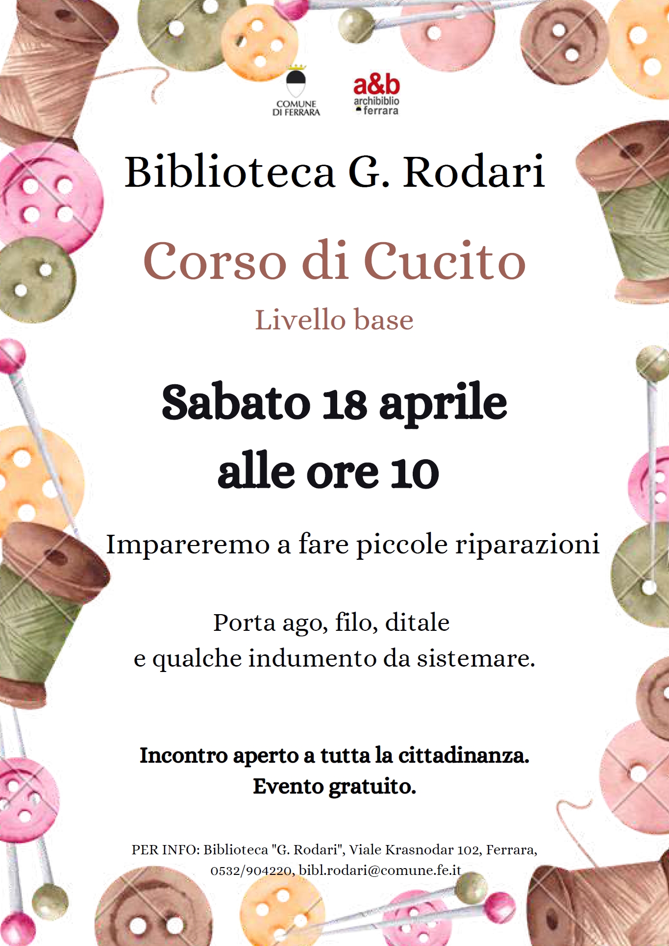 Torna l'appuntamento, sabato 18 aprile 2026 alle 10:00, con il "Corso di cucito, livello base" alla biblioteca comunale Rodari di Ferrara (viale Krasnodar 102). Sotto la guida di una sarta professionista, i partecipanti potranno fare pratica con l'arte dell'ago e del filo, imparando piccoli lavoretti di cucito.