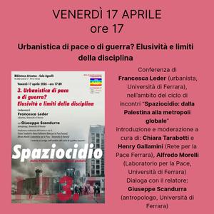Proporrà una riflessione sul contributo che l’urbanistica potrebbe dare rispetto all'attuale crisi mondiale la conferenza di Francesca Leder (urbanista, Università di Ferrara) in programma venerdì 17 aprile 2026 alle 17:00, nella sala Agnelli della biblioteca Ariostea (via Scienze 17 Ferrara), nell'ambito del ciclo di incontri "Spaziocidio: dalla Palestina alla metropoli globale".