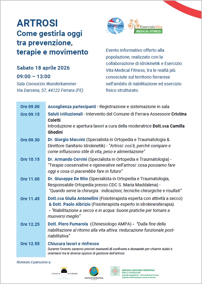 "Artrosi. Come gestirla oggi tra prevenzione, terapia, movimento". E' il titolo del convegno in programma a Ferrara sabato 18 aprile 2026, dalle 9:00 alle 13:00, nella sede del Consorzio Wunderkammer (via Darsena 57), organizzato in forma congiunta da Esercizio Vita e Idrokinetik, realtà del territorio impegnate nella riabilitazione e nella diffusione di un concetto di attività fisica come 'farmaco'.