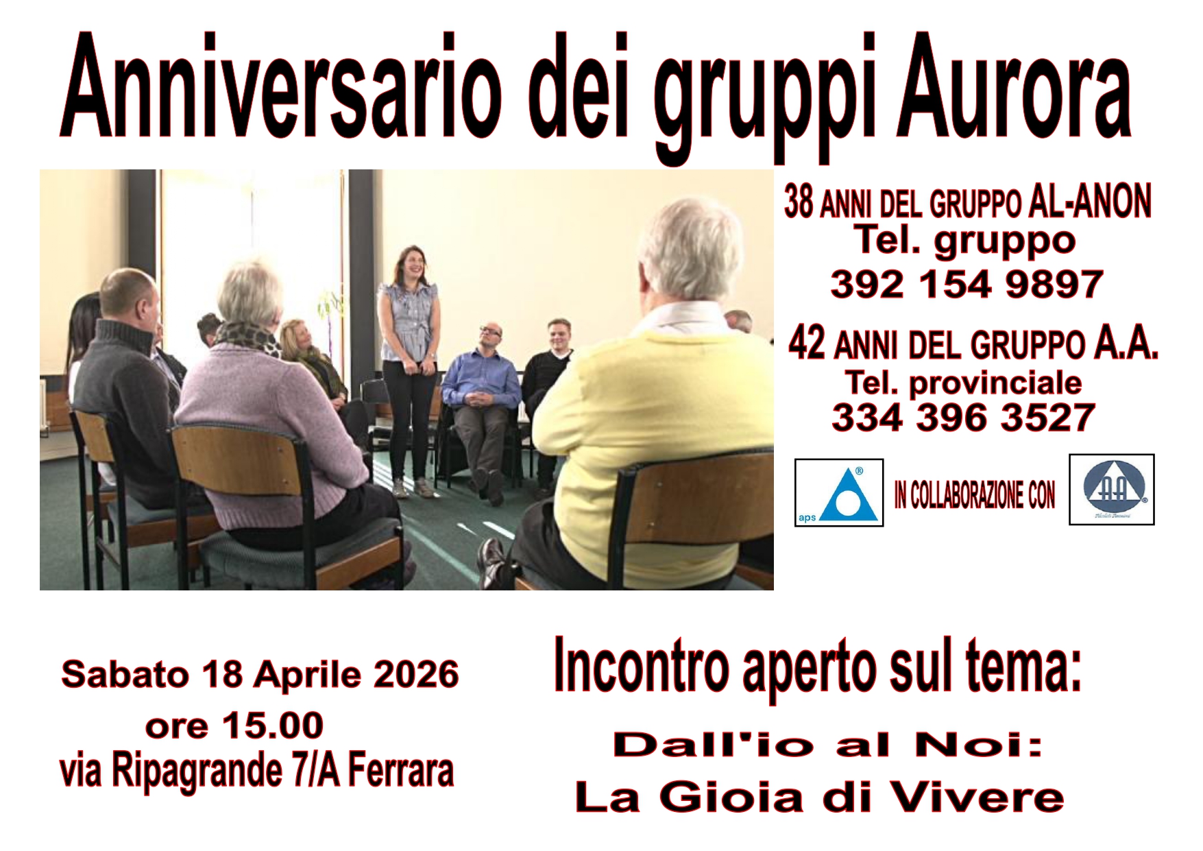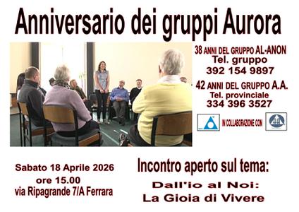 Si terrà sabato 18 aprile alle 15, nella sede unica di via Ripagrande (7/A), l'incontro "Dall'io al Noi: la gioia di vivere", dedicato al valore del sostegno reciproco e al percorso di crescita personale e collettiva promosso dai programmi Al-Anon e Alcolisti Anonimi in occasione del 38° anniversario del gruppo Aurora" familiari Al-Anon e del 42° degli Alcolisti Anonimi. L'incontro sarà aperto all'intera cittadinanza.