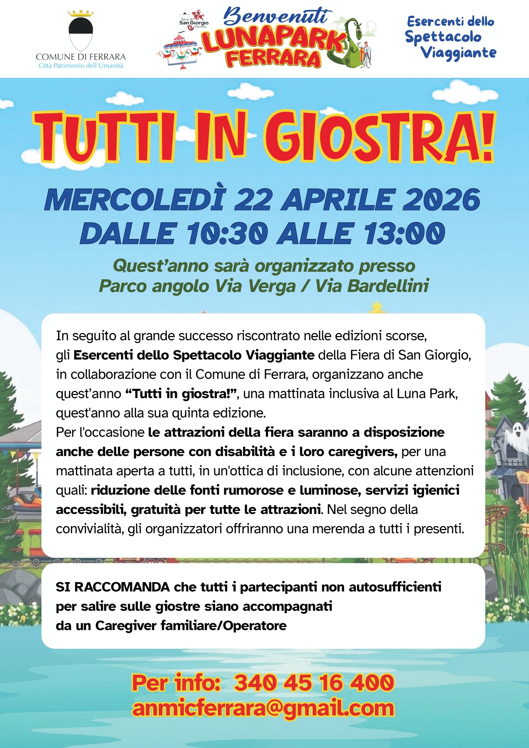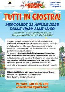 Torna anche quest'anno al Luna Park della Fiera di San Giorgio, a Ferrara, la giornata all'insegna dell'inclusione, con la messa a disposizione delle attrazioni anche per le persone con disabilità. L'iniziativa, alla quinta edizione, è in programma per mercoledì 22 aprile 2026 dalle 10:30 alle 13:00, nella nuova dislocazione del Luna Park, nell'area verde all'angolo tra via Verga e via Bardellini.
