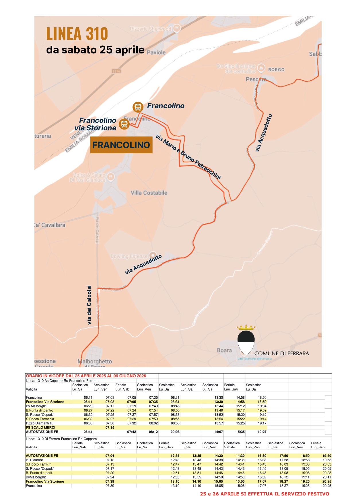 A seguito delle rilevazioni tecniche, commissionate dall'assessorato alle Opere Pubbliche, sullo stato di salute dei ponti in tutto il Comune di Ferrara, è emersa la necessità di un rinforzo strutturale al ponte che collega via Calzolai e che interessa tutta la frazione di Francolino. l'Amministrazione ha definito una strategia in due tempi per assicurarsi che non vi siano condizioni di pericolo, per questo in via preventiva ne è stata limitata la portanza.
