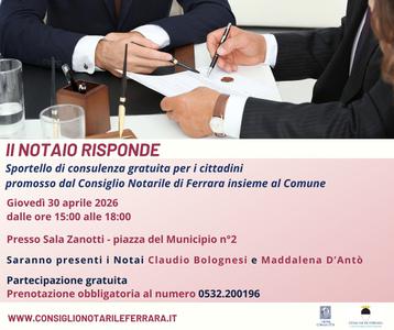 Si terrà giovedì 30 aprile 2026, dalle 15:00 alle 18:00, in una sala del Municipio di Ferrara, il quarto appuntamento dell'anno con "Il notaio risponde", lo sportello gratuito di ascolto e consulenza promosso dal Consiglio Notarile in collaborazione con il Comune di Ferrara.